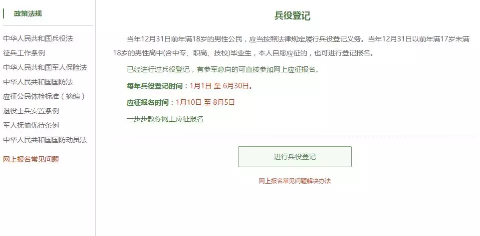 在這個頁面中,會告知我們報名時間以及參軍的政策說明,建議看后,點擊“進(jìn)行兵役登記”,邁出你軍旅生涯的第一步吧!