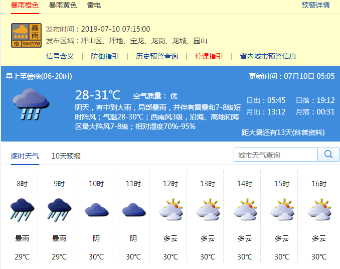 深圳新聞網(wǎng)2019年7月10日訊 7月10日早晨6時(shí)50分從深圳市氣象臺(tái)獲悉,過(guò)去1小時(shí),龍崗區(qū)(寶龍、龍崗、龍城、園山街道、坪地街道)和坪山區(qū)累計(jì)雨量已達(dá)暴雨,預(yù)計(jì)強(qiáng)降雨還將持續(xù)1小時(shí)左右,深圳市氣象臺(tái)于7月10日6時(shí)45分在龍崗區(qū)(寶龍、龍崗、龍城、園山街道)發(fā)布暴雨橙色分區(qū)預(yù)警,7時(shí)15分又在坪山區(qū)和龍崗區(qū)坪地街道發(fā)布暴雨橙色分區(qū)預(yù)警。全市進(jìn)入暴雨防御狀態(tài),請(qǐng)注意防御。全市中小學(xué)、幼兒園可視情況推遲上學(xué)。