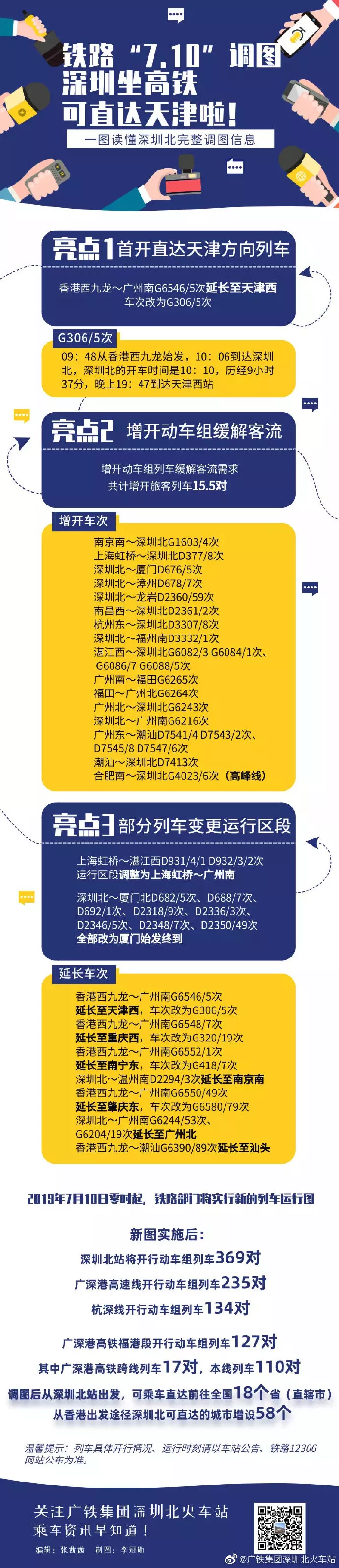 根據(jù)新的運(yùn)行圖安排,深圳北站將開(kāi)行動(dòng)車組列車369對(duì),廣深港高速線開(kāi)行動(dòng)車組列車235對(duì);杭深線開(kāi)行動(dòng)車組列車134對(duì)?!?·10”調(diào)圖后,深圳北站首開(kāi)前往天津方向列車,屆時(shí)從深圳北站出發(fā),可乘車直達(dá)前往全國(guó)18個(gè)?。ㄖ陛犑校粡南愀鄢霭l(fā)途徑深圳北可直達(dá)的城市增設(shè)58個(gè)。