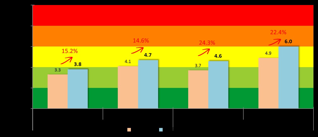 龍舟水期間(5月21日-6月20日),工作日早、晚高峰時段全市交通運(yùn)行較3-4月份(正常天氣情況)均呈現(xiàn)不同程度惡化,其中中心城區(qū)(福田區(qū)、羅湖區(qū))擁堵惡化明顯。