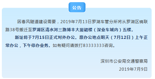 公告 因春風隧道建設(shè)需要,2019年7月13日羅湖車管分所將從羅湖區(qū)錦聯(lián)路38號搬遷至羅湖區(qū)清水河三路博豐大廈裙樓(深業(yè)車城內(nèi))五樓。_ _ _ _ _ 羅湖分所新址采用全開放式的業(yè)務(wù)辦理窗口,并配套了多種自助辦理設(shè)備,為群眾構(gòu)建更加便捷高效、自主貼心的辦事環(huán)境。