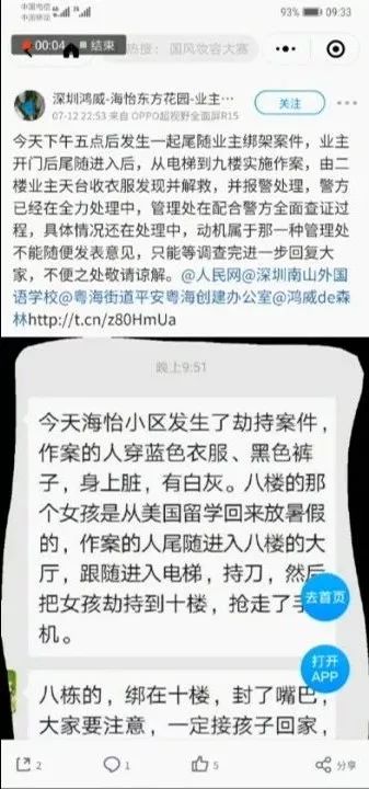 帖子下方跟著很多聊天截圖,透露被尾隨的業(yè)主是個年輕女孩,“嫌疑人持刀把女孩劫持到十樓,搶走手機”,女孩被“封住嘴巴”,還說“嫌疑人在小區(qū)內(nèi)轉(zhuǎn)了很久尋找目標”。記者今天中午來到位于南山科技園南區(qū)的涉事小區(qū),業(yè)主們說這事讓他們很震驚。