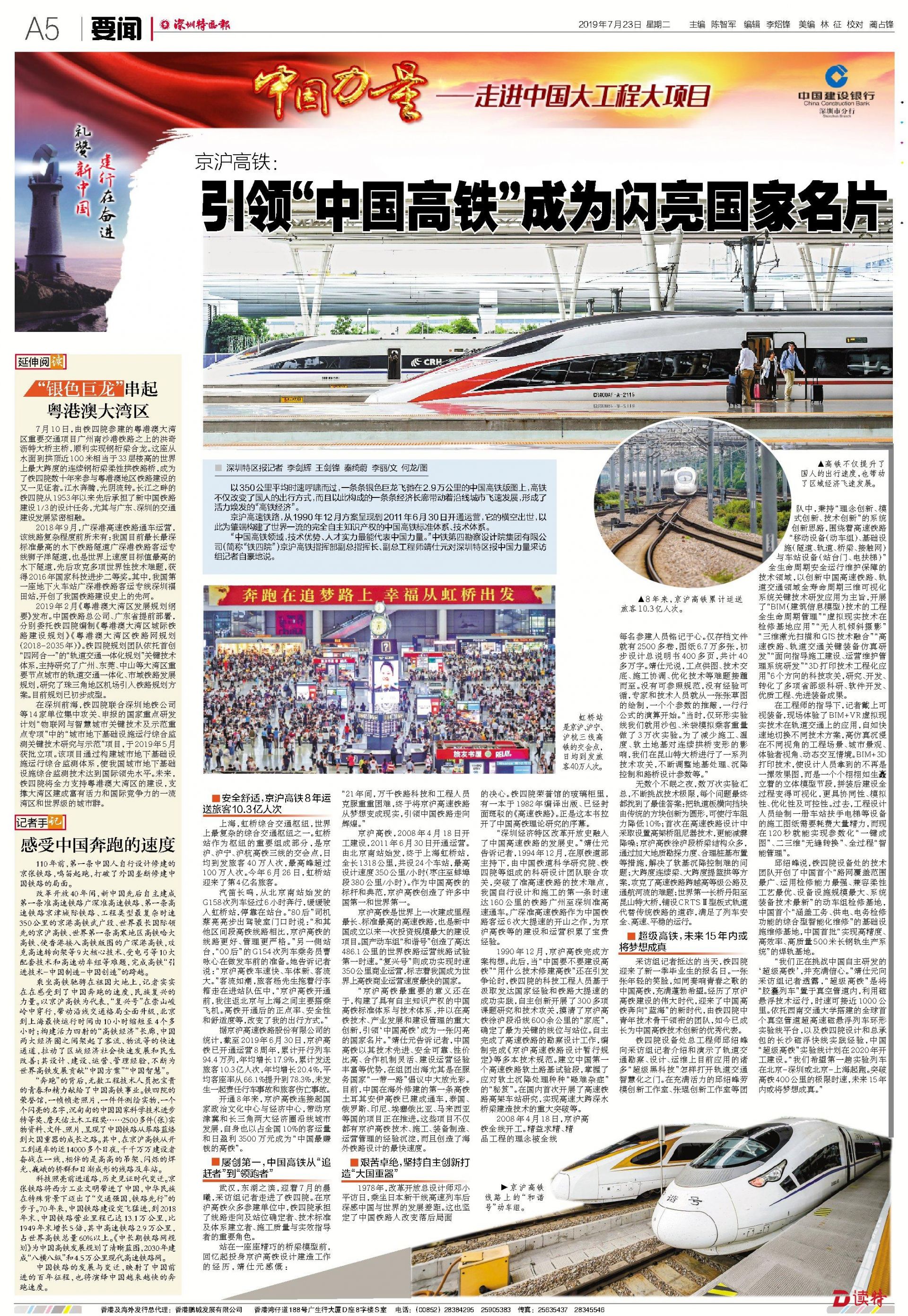 乘坐高鐵馳騁在祖國大地上,記者實實在在感受到了中國奔跑的速度,民族復興的力量。以京滬高鐵為代表,“復興號”在崇山峻嶺中穿行,帶動沿線交通格局全面升級,北京到上海最快運行時間由10小時縮短至4個多小時;構建活力四射的“高鐵經(jīng)濟”長廊,中國兩大經(jīng)濟圈之間架起了客流、物流等的快速通道,拉動了區(qū)域經(jīng)濟社會快速發(fā)展和民生改善;其設計、建設、運營、管理經(jīng)驗,不斷為世界高鐵發(fā)展貢獻“中國方案”“中國智慧”。