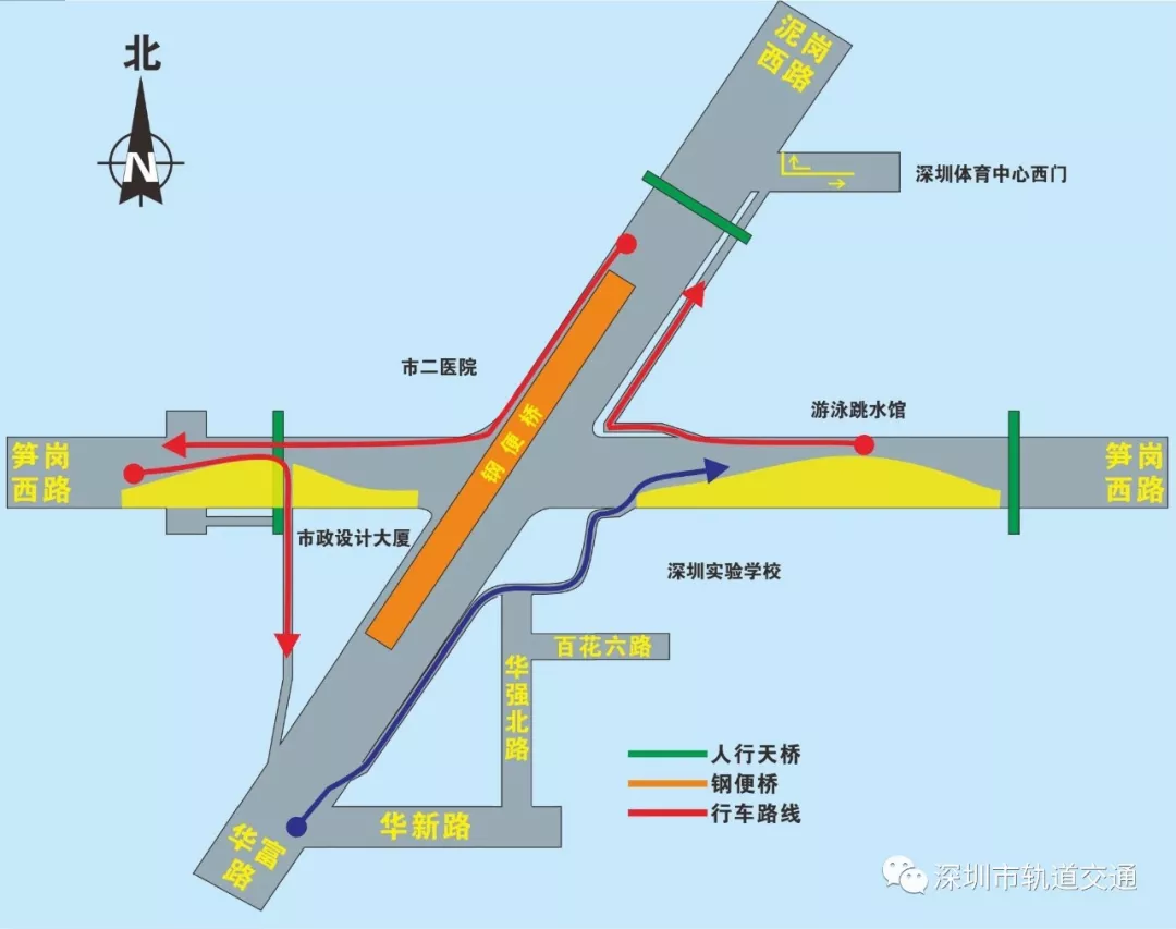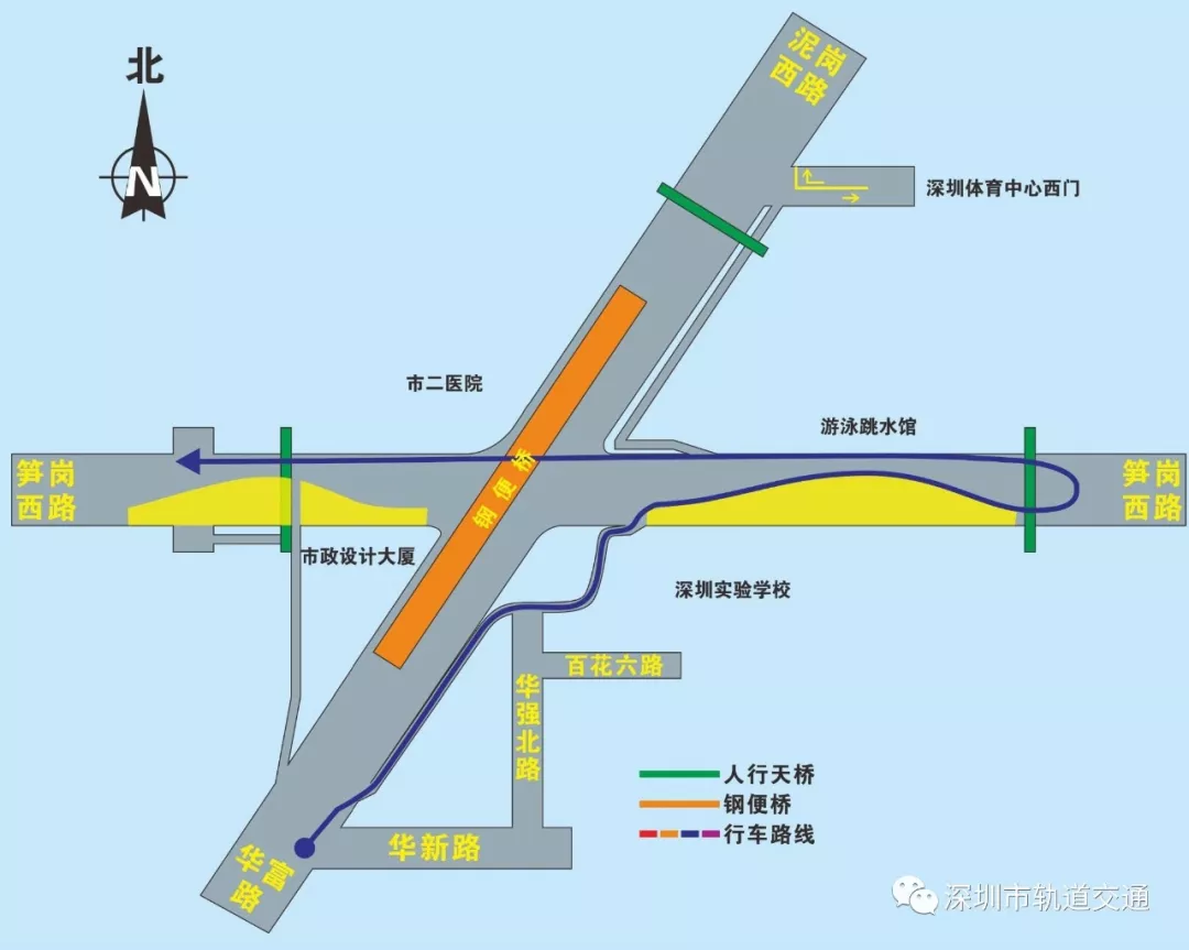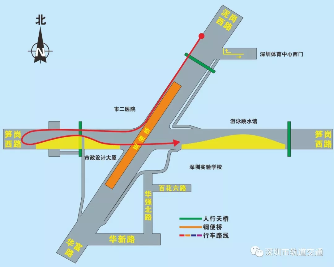 在本次調(diào)整中,華富路-泥崗西路南北向交通只能通過(guò)鋼便橋雙向六車道行車。泥崗西路、華富路、筍崗西路左轉(zhuǎn),行人線路及“市二醫(yī)院”,“體育館”公交站臺(tái)均有所調(diào)整。