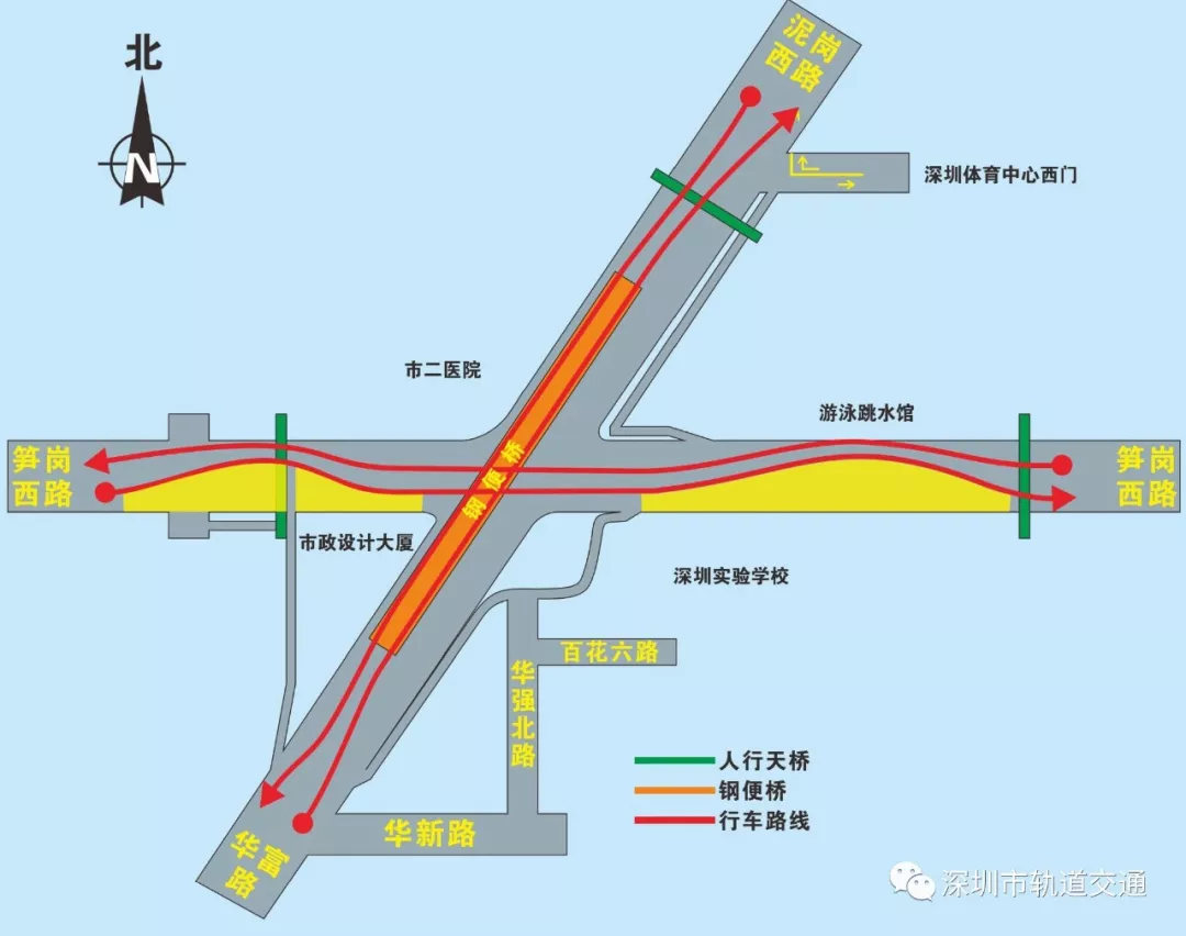 南北向:華富路—泥崗西路取消原通過(guò)平交路口的車道,轉(zhuǎn)為通過(guò)上鋼便橋?qū)崿F(xiàn)自南向北通行;東西向:筍崗西路東西向直行交通保持不變,取消原平交路口的紅綠燈。(詳見(jiàn)圖3)