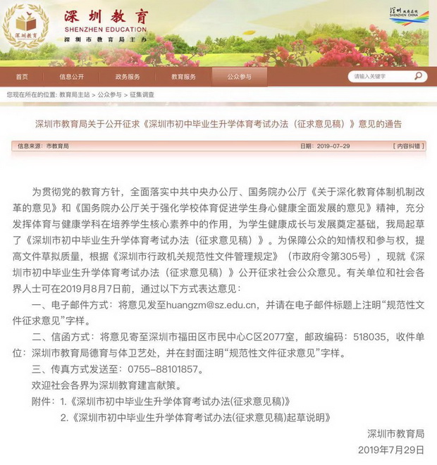 見圳客戶端·深圳新聞網(wǎng)2019年7月31日訊(見圳客戶端·深圳新聞網(wǎng)記者 余俐潔)日前,市教育局發(fā)布《深圳市初中畢業(yè)生升學(xué)體育考試辦法(征求意見稿)》(以下簡稱《考試辦法》)。根據(jù)《考試辦法》中考體育必考科目調(diào)整為中長跑(男生1000米,女生800米)或100米游泳(不限泳姿)二選一,考試總分由現(xiàn)行的30分調(diào)整為50分,從2019年入學(xué)的初一學(xué)生開始實(shí)施,即到2022年及以后的中考考生適用新方案。征求意見時(shí)間至2019年8月7日。