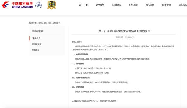 繼深航之后,東航也剛剛發(fā)布了關(guān)于臺灣地區(qū)航線相關(guān)客票特殊處置的公告:涉及購買東航臺灣地區(qū)航線客票(東航實(shí)際承運(yùn)及*MU代碼共享的781客票)的自由行旅客,出票日期在2019年7月31日24:00(含)之前,旅行日期在2019年8月1日零時(shí)(含)之后的,旅客可在客票有效期內(nèi),申請辦理退票手續(xù),無須支付退票手續(xù)費(fèi)。