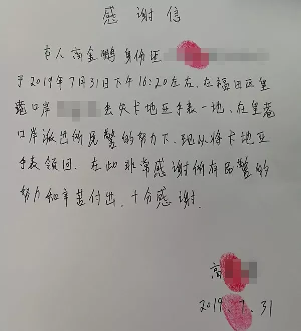 7月31日,皇崗口岸派出所接到事主高先生報(bào)警稱,其17時(shí)許在皇崗口岸某處遺失一塊手表(購置價(jià)4萬余元)。巡段民警周剛迅速出警,將事主帶回派出所詢問情況,民警周元華通過大數(shù)據(jù)分析研判,發(fā)現(xiàn)遺失手表被一男子拾到,且該男子一直在原地等待失主并未離開。隨后,周元華將男子帶回派出所歸還失物,高先生向拾金不昧的好心人表示感謝,并給民警們寫下感謝信。