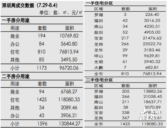表1:深圳周成交數據分類統(tǒng)計表(7.29-8.4)