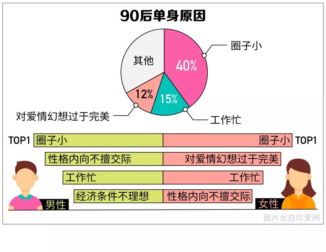 調(diào)查結(jié)果發(fā)現(xiàn),圈子?。?0%)、工作忙(15%)、對愛情幻想過于完美(12%)為90后單身的主要原因。就性別差異而言,除了圈子小之外,男性單身的主要原因是性格內(nèi)向不擅交際(33.53%)、工作忙(32.07%)以及經(jīng)濟條件不理想(19.02%)。女性單身的主要原因則是對愛情幻想過于完美(29.67%)、工作忙(28.04%)及性格內(nèi)向不擅交際(14.82%)。從學歷背景看,學歷越高越容易受困于生活圈子小和工作忙帶來的擇偶問題,而且博士人群對愛情幻想過于完美的比例比其他學歷的人群更高。