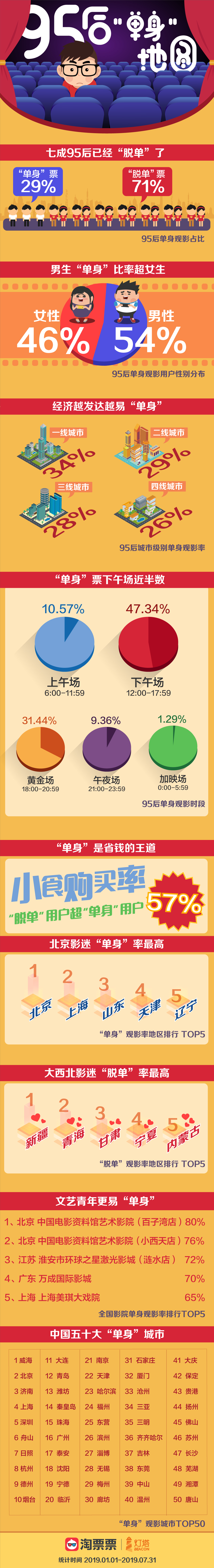 見圳客戶端·深圳新聞網(wǎng)2019年8月7日訊(見圳客戶端、深圳新聞網(wǎng)記者 陳婕)七成95后已經(jīng)“脫單”了、經(jīng)濟越發(fā)達地區(qū)“單身”率越高,北京、上海、山東成最“單身”地區(qū)……七夕來臨之際,用戶觀影決策平臺淘票票和燈塔專業(yè)版聯(lián)合發(fā)布了針對觀影人群的《95后“單身”地圖》,以“單身”觀影的維度,去側(cè)面觀察時下年輕人的情感狀態(tài)。