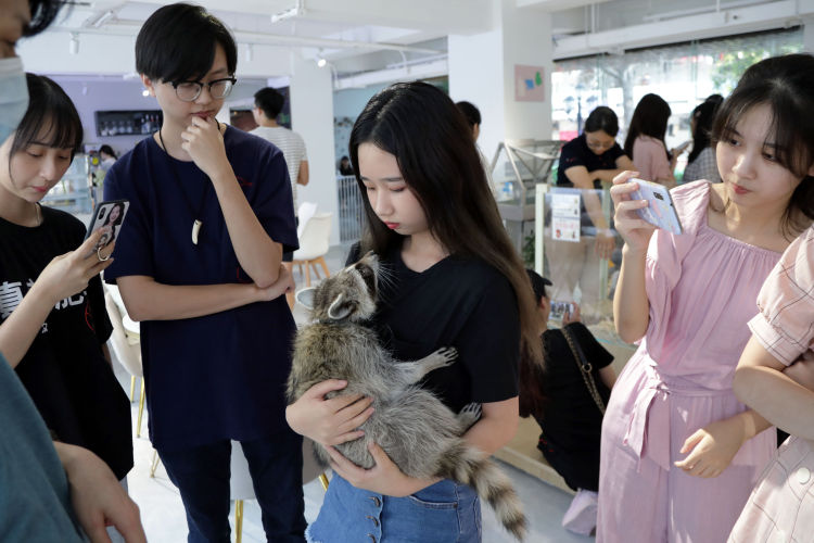 除了小動物和飼養(yǎng)員們,這里還聚集了許多年輕女孩兒,她們有的相互認識,輪流跟店里的小浣熊撓癢癢拍照;有的不認識彼此,卻因為飼養(yǎng)過同樣的小動物而熟絡起來,相互傳授養(yǎng)育自家"孩子"的經(jīng)驗。這只名為"六一"的小浣熊是這里的常駐小動物,面對市民們的熱情,"六一"毫不客氣地躺在小姐姐的臂彎里撒嬌,引來其他市民們爭相拍照。