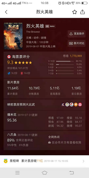 見圳客戶端·深圳新聞網(wǎng)2019年8月12日訊(見圳客戶端、深圳新聞網(wǎng)記者 陳婕)截止至8月12日下午4時(shí),記者從燈塔專業(yè)版app看到,由博納影業(yè)、阿里影業(yè)出品的電影《烈火英雄》票房達(dá)到11.64億元!這部改編自真實(shí)事件、致敬消防戰(zhàn)士的影片,展現(xiàn)出了時(shí)代精神和當(dāng)代中國(guó)英雄形象,收獲了口碑和票房的雙豐收。影片不僅獲得了高達(dá)9.3的淘票票評(píng)分,還成為了暑期檔第三部票房破10億的國(guó)產(chǎn)電影。業(yè)內(nèi)人士分析,《烈火英雄》有可能超過《掃毒2》,成為暑期檔國(guó)產(chǎn)真人電影的票房冠軍。
