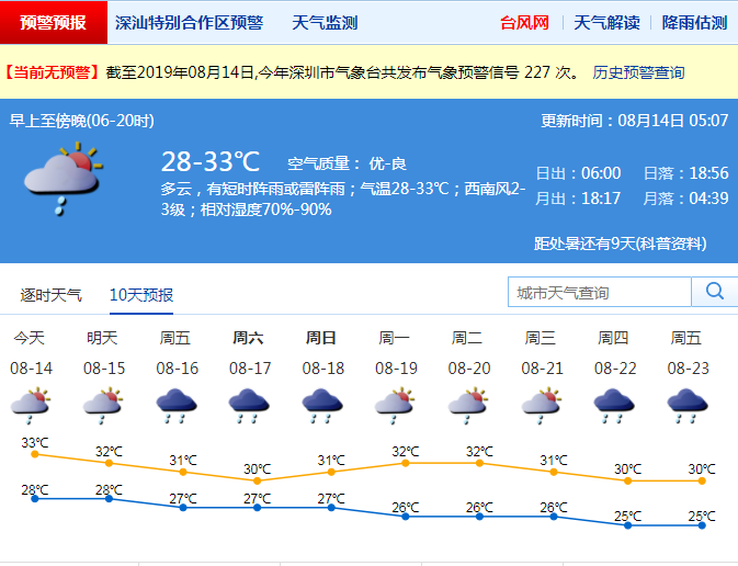 見圳客戶端·深圳新聞網(wǎng)2019年8月14日訊 昨日下午深圳再受雷雨云團(tuán)影響,市氣象臺(tái)于15時(shí)15分發(fā)布雷電分區(qū)預(yù)警。預(yù)計(jì)14-15日深圳以悶熱天氣為主,部分時(shí)間有陣雨或雷陣雨;16-18日陰天間多云,有陣雨或雷陣雨,部分時(shí)間雨勢(shì)大。