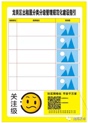 出租屋將分為寬管級(綠標)、關注級(黃標)、嚴管級(橙標)、禁止級(紅標)四個級別。結合房屋二維碼對四個級別實行動態(tài)標色管理,以房屋二維碼的底色來標注。