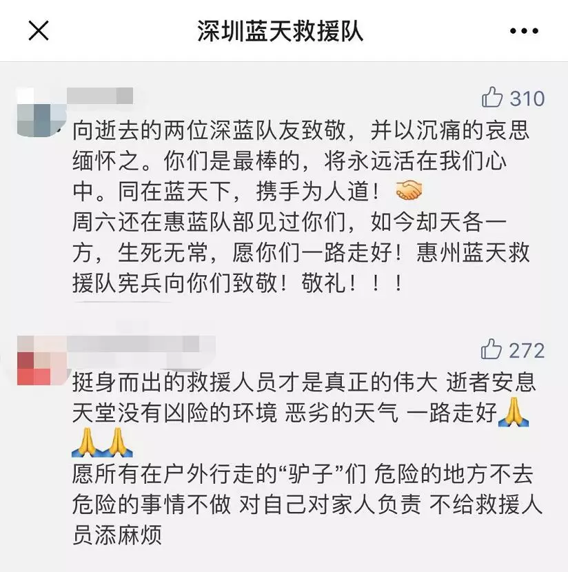 在深圳藍(lán)天救援隊微信留言中,有隊員悲痛惋惜隊友的離去,也有人質(zhì)疑驢友,明知惡劣天氣卻還要前往山野探險,這種行為是對自己對他人生命的不負(fù)責(zé)。