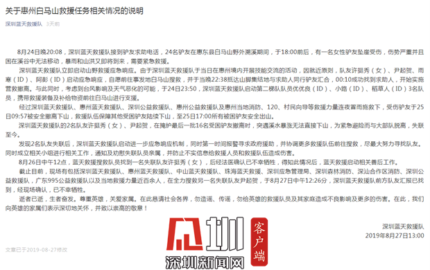 見圳客戶端?深圳新聞網2019年8月30日訊(見圳客戶端、深圳新聞網記者 張玲)8月27日下午,深圳藍天救援隊發(fā)布消息稱:8月25日,救援隊兩名隊友在掩護最后一批受困驢友撤離時,突遇溪水暴漲無法直接下山,為緊急避險而與大部隊脫離失聯(lián)。8月27日中午,最終將兩名隊友找回,經確認,兩名隊員許挺秀(女)、尹起賀已不幸犧牲。