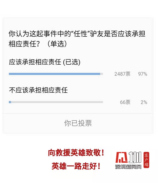 有一個細節(jié)是,這批受困的驢友上山溯溪的時間正是深圳發(fā)布臺風預警信號的時間,因此很多人也認為在臺風天探險,驢友過于任性。在深圳新聞網微信公眾號發(fā)起的小調查(你認為這起事件中的“任性”驢友是否應該承擔相應責任?(單選))中,共有2553名網友作答,97%的人認為應該承擔相應責任。