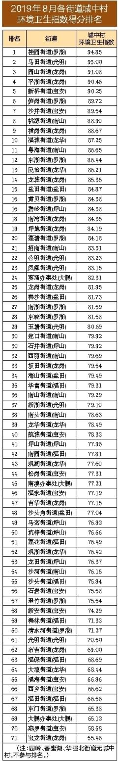 全市城中村首次單獨“應考”,成績?nèi)绾危扛鶕?jù)公布的測評結果,深圳市城中村環(huán)境衛(wèi)生指數(shù)為79.05分,光明區(qū)、羅湖區(qū)、龍崗區(qū)城中村環(huán)境衛(wèi)生指數(shù)位列三甲,城中村人口密度較大的福田區(qū)則在首次公布的城中村環(huán)境衛(wèi)生指數(shù)排名中墊底。排名前3的街道分別是桂園街道(羅湖)、馬田街道(光明)和園山街道(龍崗),而排名后3的街道分別是寶龍街道(龍崗)、燕羅街道(寶安)和大鵬辦事處(大鵬)。