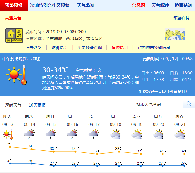 見(jiàn)圳客戶端·深圳新聞網(wǎng)2019年9月12日訊 深圳氣象局預(yù)計(jì)12日晴天間多云,天氣炎熱,局部有短時(shí)雷陣雨;氣溫28-34℃,中北部或人口密集區(qū)最高氣溫35℃以上;東風(fēng)2-3級(jí);相對(duì)濕度60%-90%。13日晴到多云,局部有短時(shí)雷雨;14-17日多云,有雷陣雨,高溫天氣逐漸緩解。