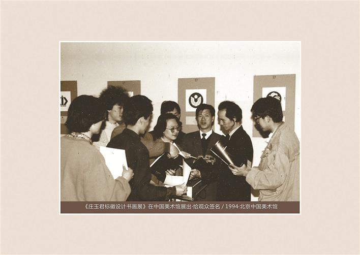 ▲1994年,《莊玉君標(biāo)徽設(shè)計(jì)書畫展》在中國美術(shù)館展出,莊玉君在現(xiàn)場給觀眾簽名。