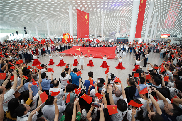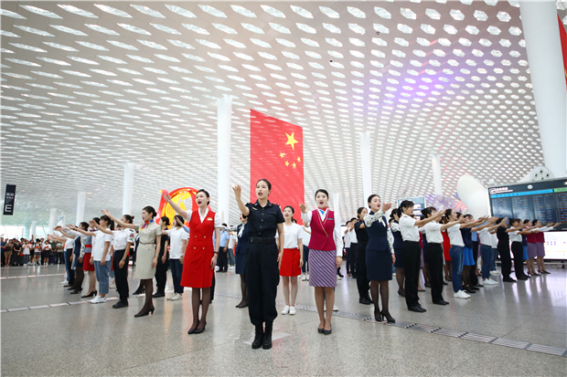 見圳客戶端·深圳新聞網(wǎng)2019年9月17日訊(見圳客戶端、深圳新聞網(wǎng) 記者 涂勝 通訊員 葉丹)為慶祝中華人民共和國成立70周年,9月17日,深圳機(jī)場聯(lián)合深圳空管站、機(jī)場海關(guān)、邊檢、公安及各航空公司,在深圳機(jī)場航站樓出發(fā)大廳、地面交通中心、國內(nèi)候機(jī)區(qū)等區(qū)域舉辦“樂動(dòng)空港歌唱祖國”演出活動(dòng)。當(dāng)天,共有200余人次參加現(xiàn)場演出。活動(dòng)現(xiàn)場,五星紅旗飄揚(yáng),航站樓內(nèi)匯成一片紅色的海洋。