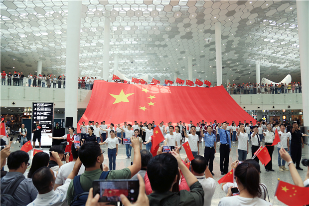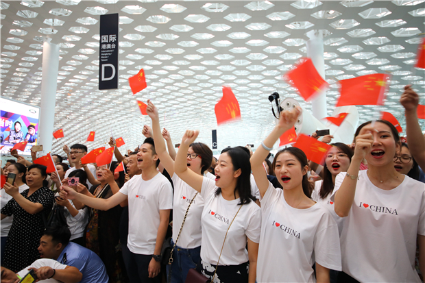 活動(dòng)現(xiàn)場,不少前來乘機(jī)的旅客和工作人員一同揮舞國旗、合唱 (攝影:葉丹)