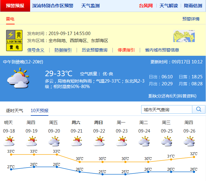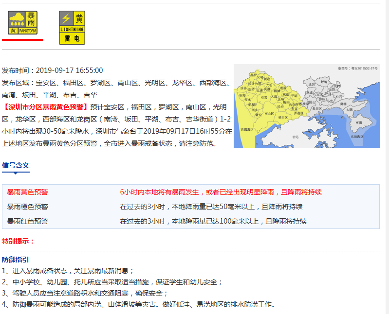 市氣象局預(yù)計寶安區(qū),福田區(qū),羅湖區(qū),南山區(qū),光明區(qū),龍華區(qū),西部海區(qū)和龍崗區(qū)(南灣、坂田、平湖、布吉、吉華街道)1-2小時內(nèi)將出現(xiàn)30-50毫米降水,深圳市氣象臺于2019年09月17日16時55分在上述地區(qū)發(fā)布暴雨黃色分區(qū)預(yù)警,全市進入暴雨戒備狀態(tài),請注意防范。