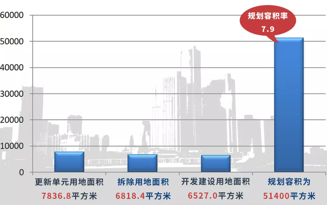 ▲更新單元用地面積7836.8平方米,拆除用地面積6818.4平方米,開發(fā)建設(shè)用地面積6527.0平方米,規(guī)劃容積為51400平方米,規(guī)劃容積率7.9。
