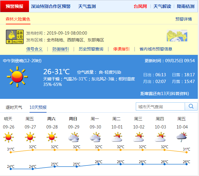 見圳客戶端?深圳新聞網(wǎng)2019年9月25日訊 今天上班路上,小涼風(fēng)嗖嗖吹著,恍然有種入秋的感覺。一直停留在夏天不肯走的深圳終于有了準(zhǔn)備入秋的預(yù)兆?這個(gè)你就想太多了,根據(jù)氣象學(xué)上入秋的標(biāo)準(zhǔn),連續(xù)五天滑動(dòng)平均氣溫穩(wěn)定<22 ℃,從第一天開始便進(jìn)入到氣象學(xué)意義上,真正的秋天。所以,你眼前的"秋"不是秋!深圳平均入秋月份為11月(深圳平均入秋時(shí)間11月3日,2018年入秋時(shí)間為11月22日)。