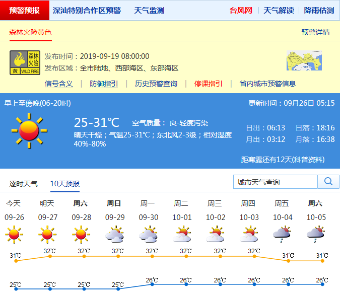由于近期大氣層結(jié)靜穩(wěn),深圳持續(xù)受偏北下沉氣流控制,近地面風(fēng)力微弱且中西部地區(qū)出現(xiàn)局地風(fēng)向輻合,氣象條件不利于污染物擴(kuò)散,25日下午中西部地區(qū)出現(xiàn)了輕微到輕度灰霾;預(yù)計(jì)入夜后,能見度將逐漸好轉(zhuǎn)。26-30日深圳晴天到多云為主,空氣干燥。26日氣溫25-31℃,陽光充足;展望10月初晴朗干燥天氣持續(xù)。森林火險(xiǎn)預(yù)警持續(xù)生效中。