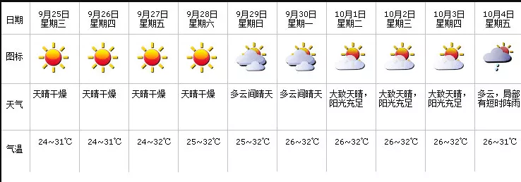 據(jù)市氣象局預(yù)計(jì),國慶假期前半段天氣整體晴好 ,看到這一排小太陽超開心的有木有?!