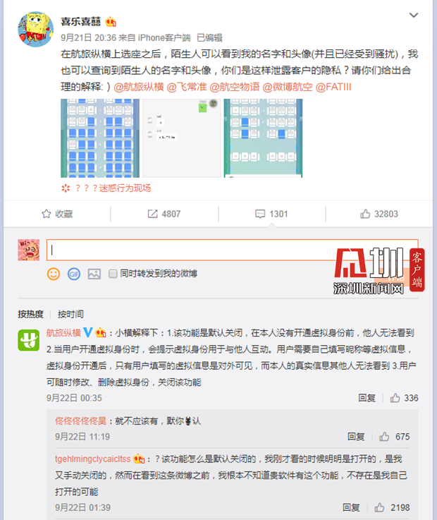 見圳客戶端.深圳新聞網2019年9月26日訊(見圳客戶端、深圳新聞網記者 張玲)“航旅縱橫”APP,最近因為一個舉動被用戶質疑泄露個人隱私。9月21日,微博網友@喜樂喜囍發(fā)微博稱,這款APP默認開啟“允許他人與我進行私聊”,在用戶選座后,陌生人可以查詢到自己的名字和頭像。該博主將陌生人騷擾的頁面截圖發(fā)上了微博,引發(fā)網友熱烈討論,在其個人話題下,有評論1301條,轉發(fā)4807次。