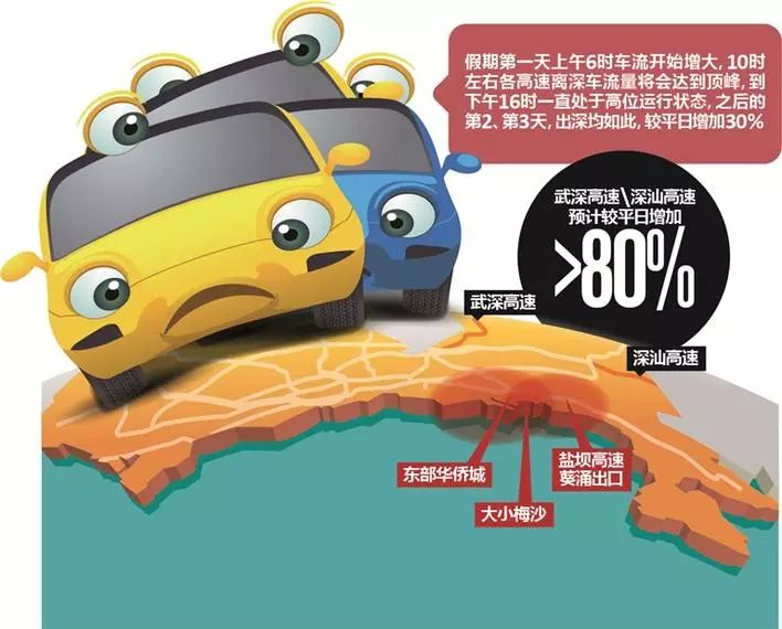 ⑩深圳交警預測全市從9月30日下午開始交通流量加大,9月30日、10月1日出行量達到頂峰。各高速公路、市內(nèi)各景點、商圈、購物點以及東部景區(qū)會出現(xiàn)不同程度的擁堵,全市各區(qū)羅湖區(qū)最為擁堵,其次是福田區(qū)、南山區(qū)。預計‘國慶’期間,全市出深和入深車輛總數(shù)均將超過170萬輛。