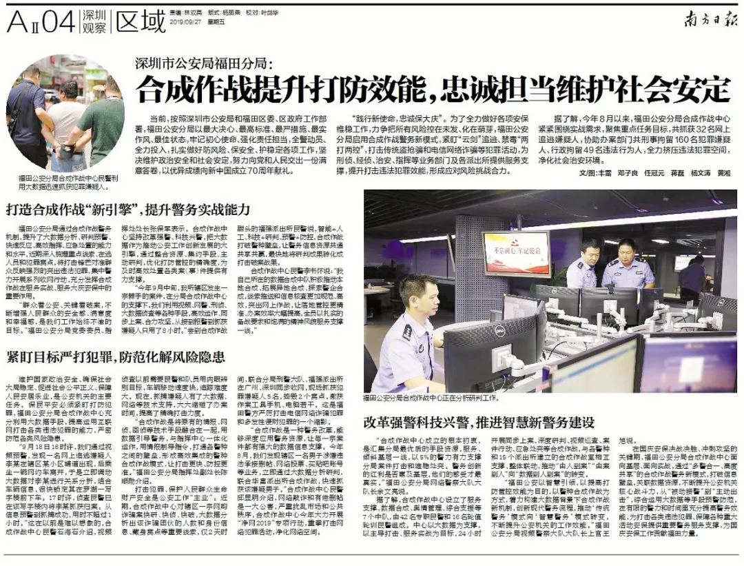 “群眾看公安、關(guān)鍵看破案,不斷增強(qiáng)人民群眾的安全感、滿意度和幸福感,是我們工作始終不渝的目標(biāo)。”福田公安分局黨委委員、指揮處處長(zhǎng)張保軍告訴筆者。合成作戰(zhàn)中心堅(jiān)持改革強(qiáng)警、科技興警,把大數(shù)據(jù)作為推動(dòng)公安工作創(chuàng)新發(fā)展的大引擎,通過(guò)整合資源、集約手段、主動(dòng)研判,優(yōu)化打防管控的精確度,為及時(shí)高效處置各類案(事)件提供有力支撐,確保國(guó)家政治安全和社會(huì)大局穩(wěn)定。