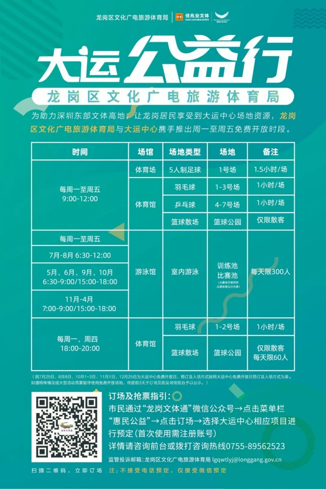 此外,龍崗區(qū)文化廣電旅游體育局與大運(yùn)中心攜手推出的文體惠民開(kāi)放項(xiàng)目周一至周五每天免費(fèi)開(kāi)放半天持續(xù)進(jìn)行中,具體時(shí)間及搶票攻略如下: