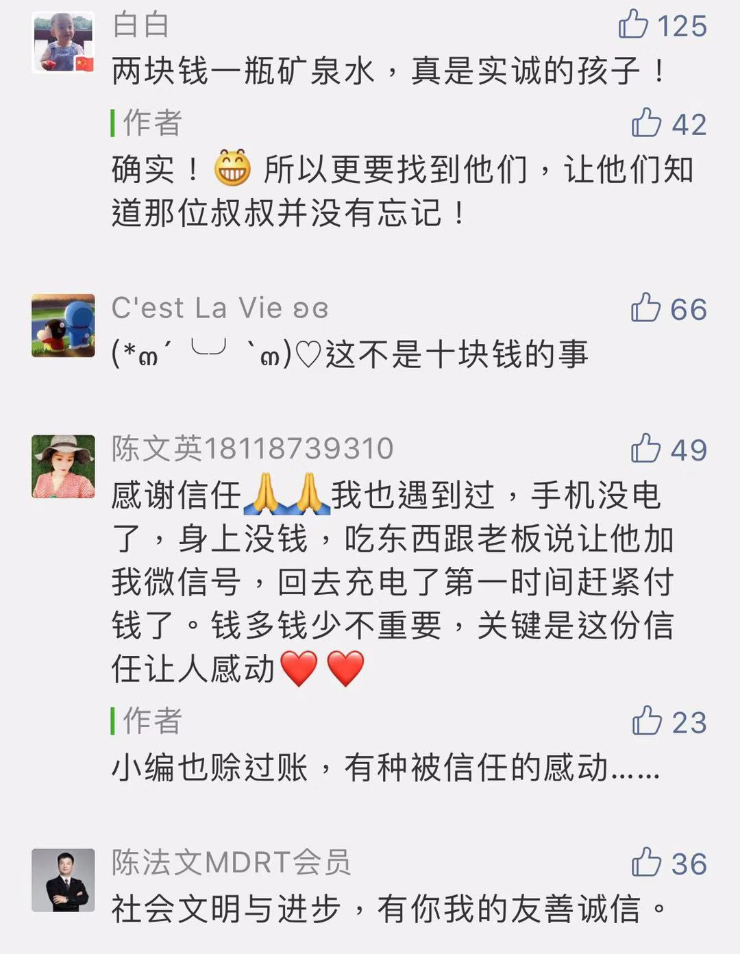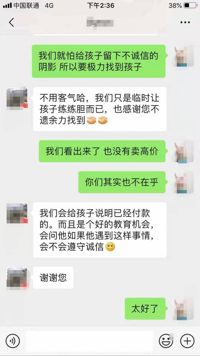 賣水男孩爸爸告訴張先生,他是從朋友的轉(zhuǎn)發(fā)中,看到這個(gè)消息的。他介紹說,他們那天只是臨時(shí)讓孩子練練膽,并對張先生努力尋找孩子,實(shí)現(xiàn)對孩子承諾的誠信行為表示感謝?!拔視?huì)給孩子說明已經(jīng)付款的,而且這是個(gè)好的教育機(jī)會(huì),我會(huì)問他,如果他遇到這樣的事情,會(huì)不會(huì)遵守誠信?!辟u水男孩爸爸告訴張先生,“沒有想到你為了守護(hù)一份誠信,借助網(wǎng)絡(luò)媒體的力量,花大力氣尋找并支付礦泉水錢,這份堅(jiān)持,讓我們和孩子都非常感動(dòng)。我們也已經(jīng)與孩子溝通整件事情,并借此機(jī)會(huì)告訴他換位思考,如果遇到類似情況,也應(yīng)堅(jiān)持誠信、與人為善的傳統(tǒng)美德?!?/p>
