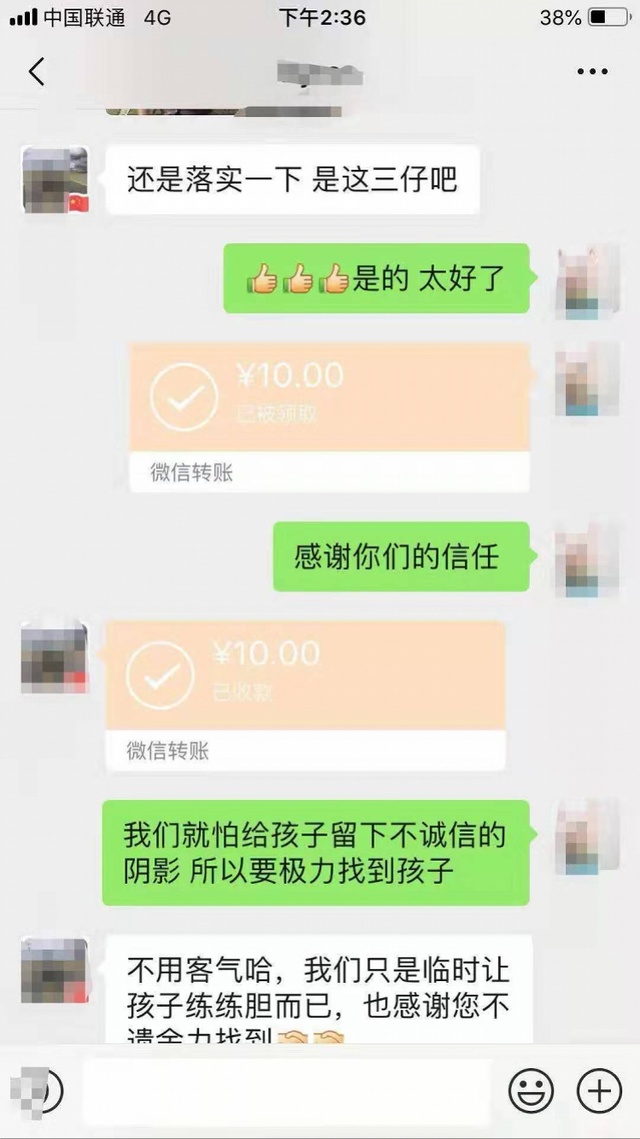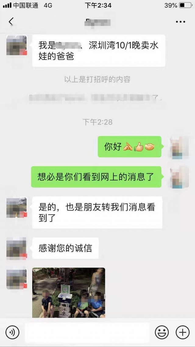 4日,剛從深圳返回青島的張先生告訴記者,中午2時(shí)35分,他的微信出現(xiàn)一個(gè)新增好友,對方說自己是深圳灣10月1日晚賣水男孩的爸爸,張先生立刻把對方加為好友。賣水男孩爸爸通過微信給張先生發(fā)來一張照片,是國慶當(dāng)晚孩子在路邊賣水時(shí)拍的,讓張先生確認(rèn)一下是不是照片上的孩子。“是他們,太好了,終于找到了。”張先生隨即通過微信轉(zhuǎn)賬10元錢過去,賣水男孩爸爸也收款成功。(此前報(bào)道:緊急尋人!深圳灣畔的賣水孩子,青島大叔在找你…)