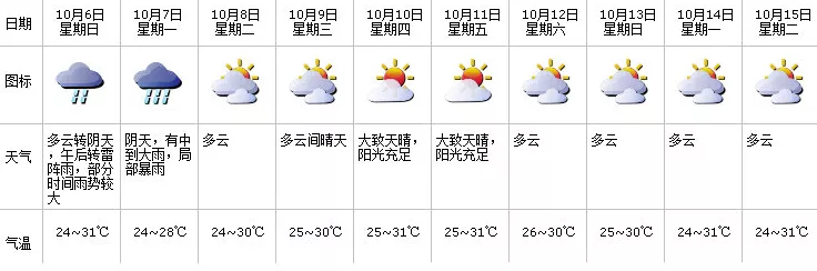 今明兩日有中到大雨,局部暴雨,降雨集中在6日午后至7日上午,部分時間伴有雷暴,沿海和高地陣風(fēng)6-8級,6日氣溫24-31℃;8-11日多云到晴天;12日有小雨。假期返程高峰期有明顯降雨和大風(fēng),請加強海上活動和道路交通安全的管理。