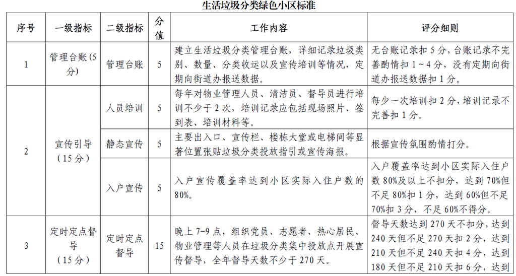分類成效顯著的住宅區(qū),可認定為“生活垃圾分類綠色小區(qū)”。獲獎小區(qū)將通報表揚并按照10萬元/1000戶的標準補助,不足1000戶的,每減少100戶,補助資金減少5%,超過1000戶的,每增加100戶,補助資金增加5%,最高補助不超過30萬元,補助資金僅用于生活垃圾分類相關(guān)的設(shè)施采購、宣傳培訓(xùn)以及勞務(wù)補貼等方面;生活垃圾分類綠色小區(qū)的物業(yè)服務(wù)企業(yè)可優(yōu)先申報深圳市級綠色物業(yè)管理評價標識,通過市住房建設(shè)部門審核后獲得綠色物業(yè)管理評價補助資金。