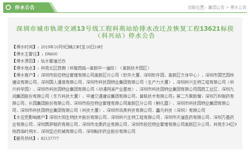 10月9日晚23時至10日10時,因給水管道遷改,科苑北區(qū)西側(cè)將停水,停水客戶包括中建交通建設(shè)集團有限公司、深圳市科技園物業(yè)集團有限公司、深圳市迅美科技有限公司等多個企業(yè)。