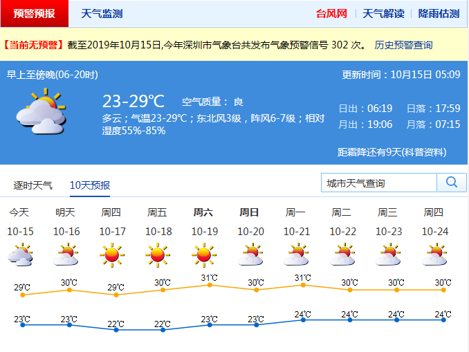 見圳客戶端·深圳新聞網(wǎng)2019年10月15日訊 記者從深圳市氣象局了解到,今日深圳多云,可見陽光;氣溫23-29℃,有些許涼意;東北風(fēng)3級,沿海、高地和海區(qū)最大陣風(fēng)7-8級;16-21日再轉(zhuǎn)晴天干燥天氣,早晚氣溫舒適,適宜戶外活動。