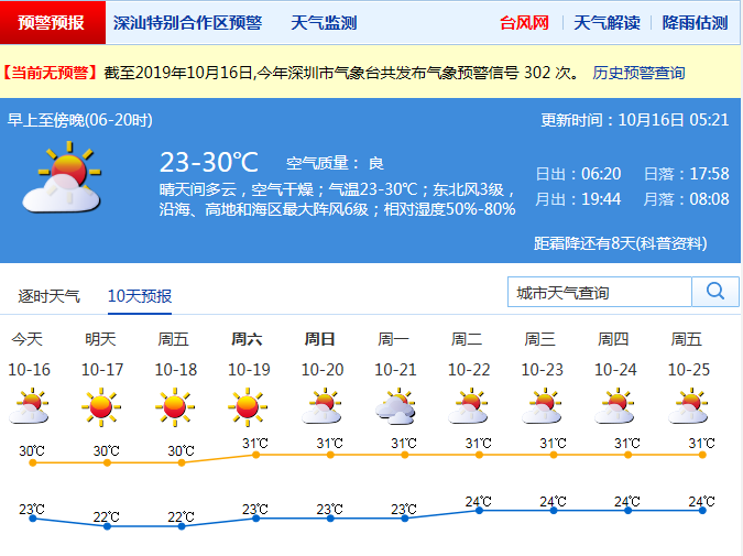 見圳客戶端·深圳新聞網(wǎng)2019年10月16日訊 深圳14日夜間局部有分散陣雨,累計(jì)雨量在3毫米以下;最低氣溫23-24℃,15日白天轉(zhuǎn)晴天間多云。東北風(fēng)3級,沿海和高地陣風(fēng)6-7級。