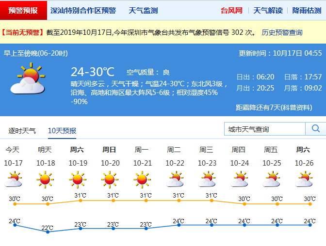 見圳客戶端·深圳新聞網(wǎng)2019年10月17日訊 15日夜間到16日白天,我市晴天間多云,有分散陣雨,最大雨量出現(xiàn)在龍城街道愛聯(lián)站5.4毫米;早晨最低氣溫22-24℃;東風(fēng)2-3級,沿海和高地陣風(fēng)6-7級;相對濕度40%-90%。