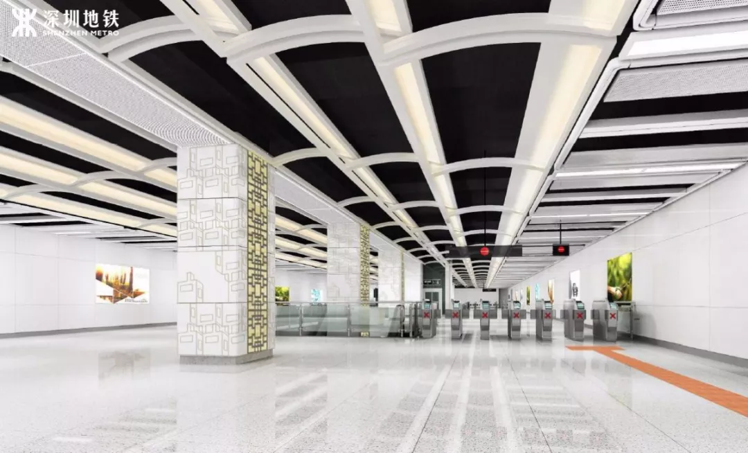 本線路標準站(其他站是特色站)包括前灣站、荔林站、南油西站、南山書城站、深大南站、高新南站,標準站設計方案天花采用“一步一高,發(fā)展騰飛”的疊級造型,充分結合車站的綜合管線設計,利用車站空間特點,在空間上重點體現(xiàn)個性區(qū),保證空間的整體性,讓空間更為舒展、開闊。