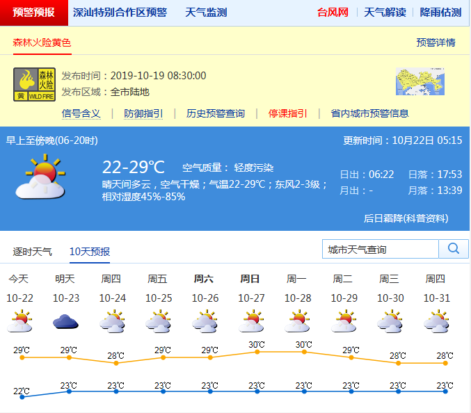 見圳客戶端·深圳新聞網2019年10月22日訊(見圳客戶端、深圳新聞網記者 施冰冰)最近深圳的天氣,早晚有點入秋的涼爽,可午后溫度依然不低。昨天白天,全市晴天間多云,早晨最低氣溫21-23℃,部分地區(qū)最高氣溫超過了33℃。天氣干燥,全市森林火險黃色預警信號生效中。
