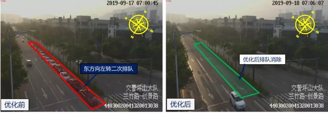 為解決該時段擁堵情況,交警優(yōu)化調整該路口早高峰時段紅綠燈,將早高峰時段由7時30分提前至6時50分,同時增加東方向左轉綠燈時間20秒,以滿足車流通過需求。優(yōu)化后東方向左轉二次排隊情況消除,東方向左轉車通行量由原144pcu/h上升至196pcu/h,上升36.1%。