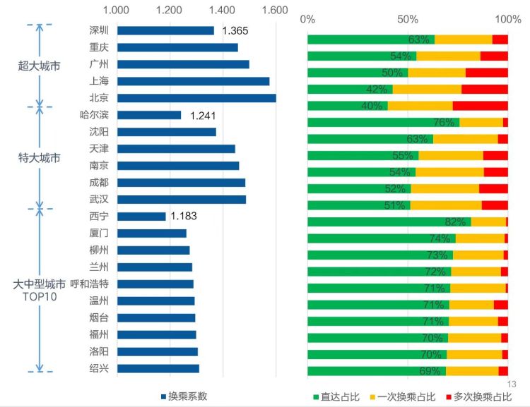 對(duì)于平均換乘次數(shù)最小的西寧,82%的公交出行需求不必?fù)Q乘、99%的需求至多換乘1次就可以到達(dá)目的地,平均步行距離也最??;深圳、哈爾濱公交的平均步行距離和換乘距離分別在超大城市和特大城市中最小。