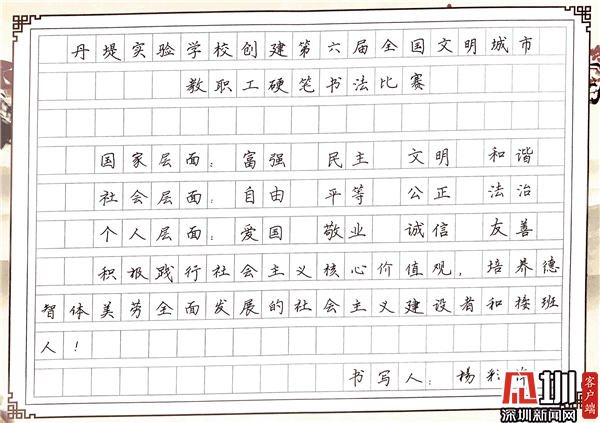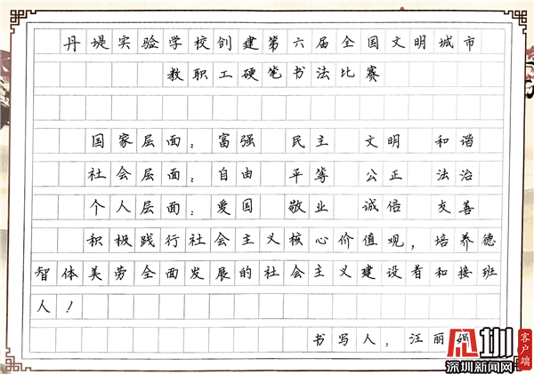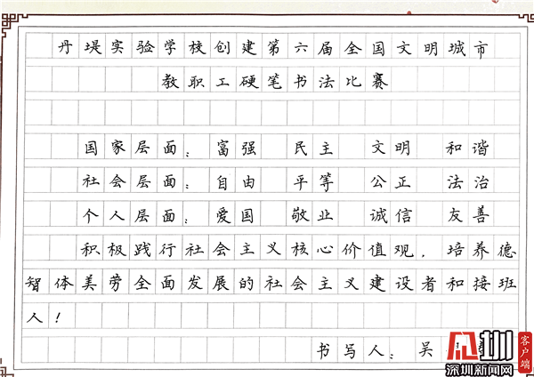 見(jiàn)圳客戶端·深圳新聞網(wǎng)10月29日訊(見(jiàn)圳客戶端、深圳新聞網(wǎng)記者 潘寶儀 通訊員 袁小俊 圖/朱雅琪 ) 為落實(shí)立德樹人總目標(biāo)、培育和踐行社會(huì)主義核心價(jià)值觀,創(chuàng)建文明城市,積極倡導(dǎo)全校教職工勤練教學(xué)基本功,提高教師綜合素養(yǎng),豐富課余生活,展示丹堤實(shí)驗(yàn)學(xué)校教職工風(fēng)采,學(xué)校于10月25日舉行了“創(chuàng)建第六屆全國(guó)文明城市教職工硬筆書法比賽”。