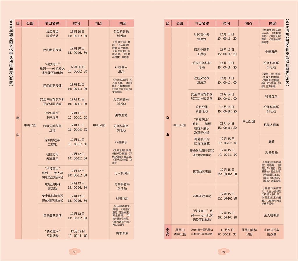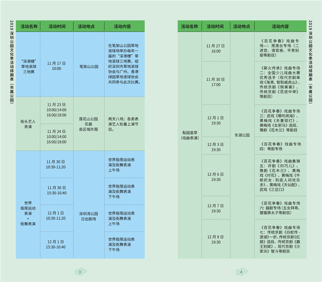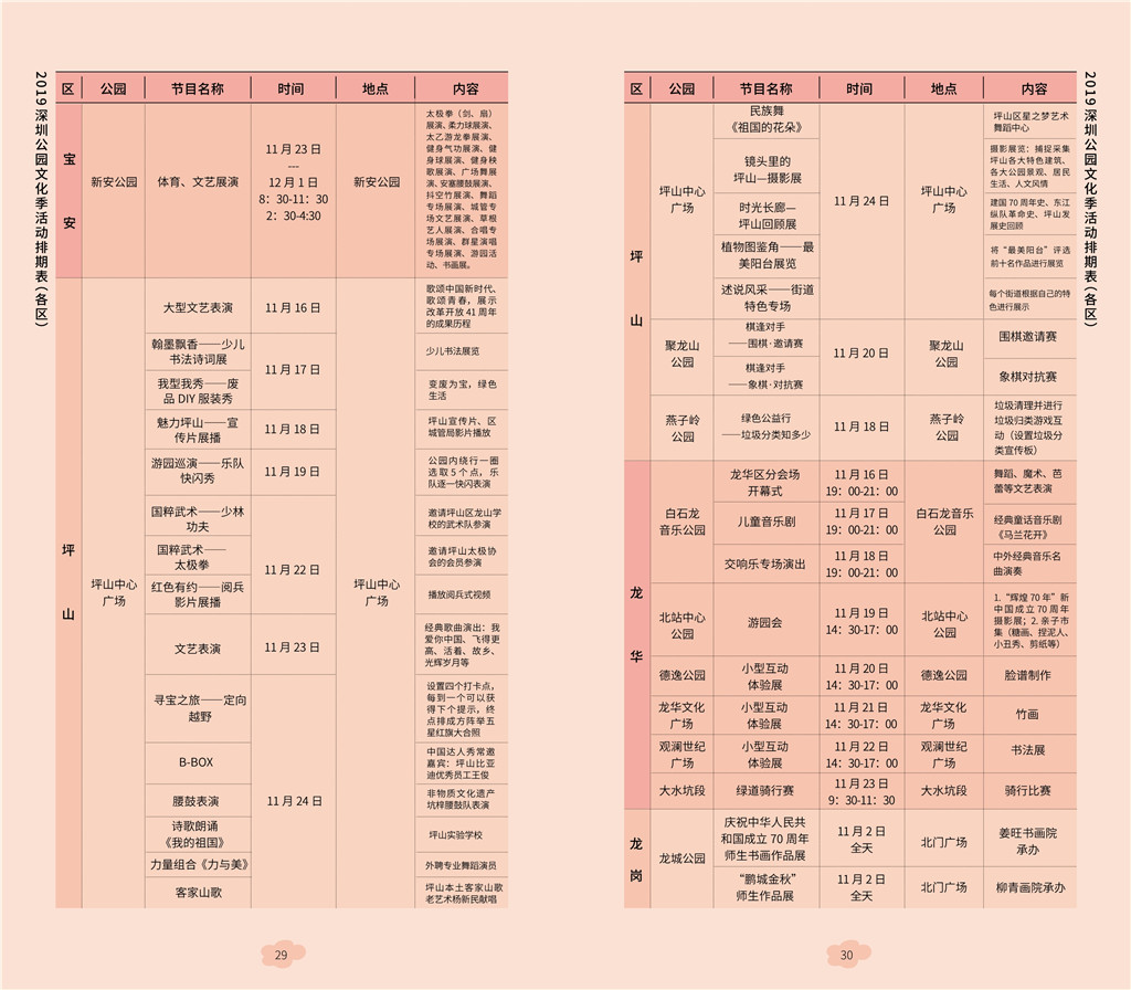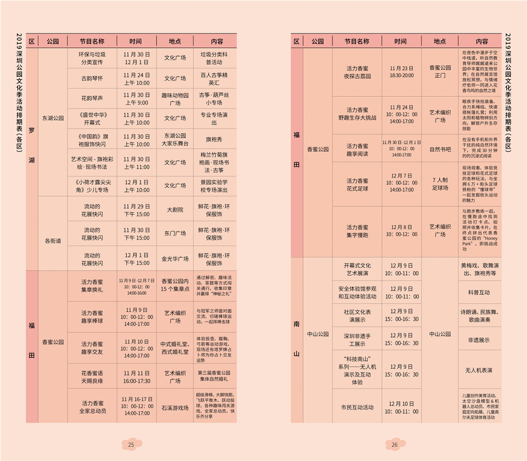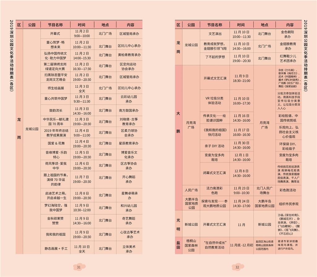 記者了解到,11月8日,2019深圳公園文化季將正式啟幕,持續(xù)至12月8日,為期一個月。舉辦地點包括蓮花山公園、深圳灣公園、園博園、東湖公園、中心公園、筆架山公園、皇崗公園等7個市屬公園和22個區(qū)屬公園。其中,市屬公園重點活動將集中在周末舉行,為廣大市民帶來精彩紛呈的公園文化盛宴。